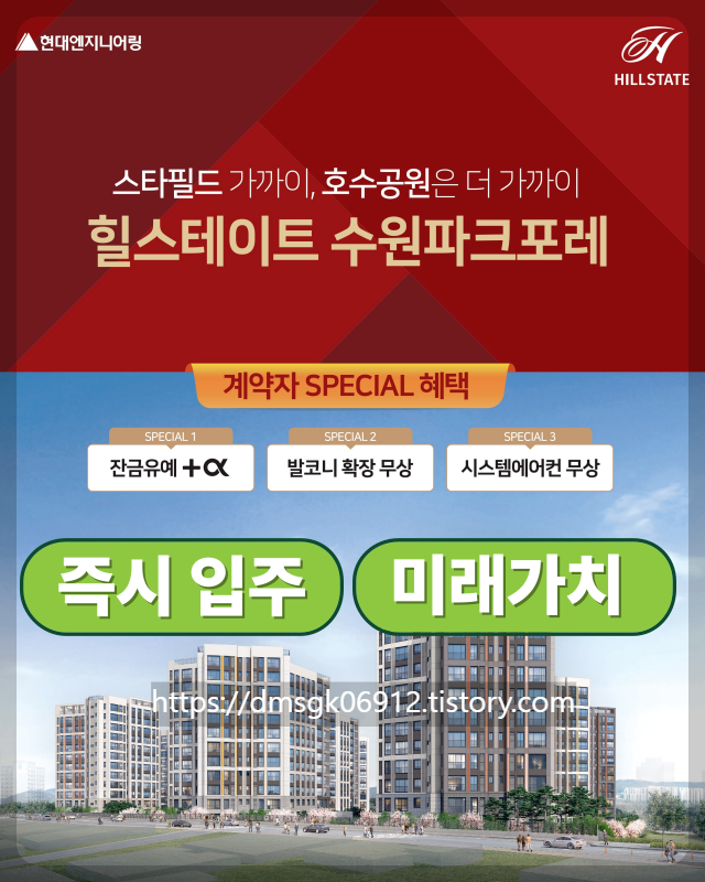 하지만 이 와중에 8억대 신축으로 분양 중이면서, 즉시 입주까지 가능한 단지가 하나 있습니다. 바로 힐스테이트 수원 파크포레입니다.
